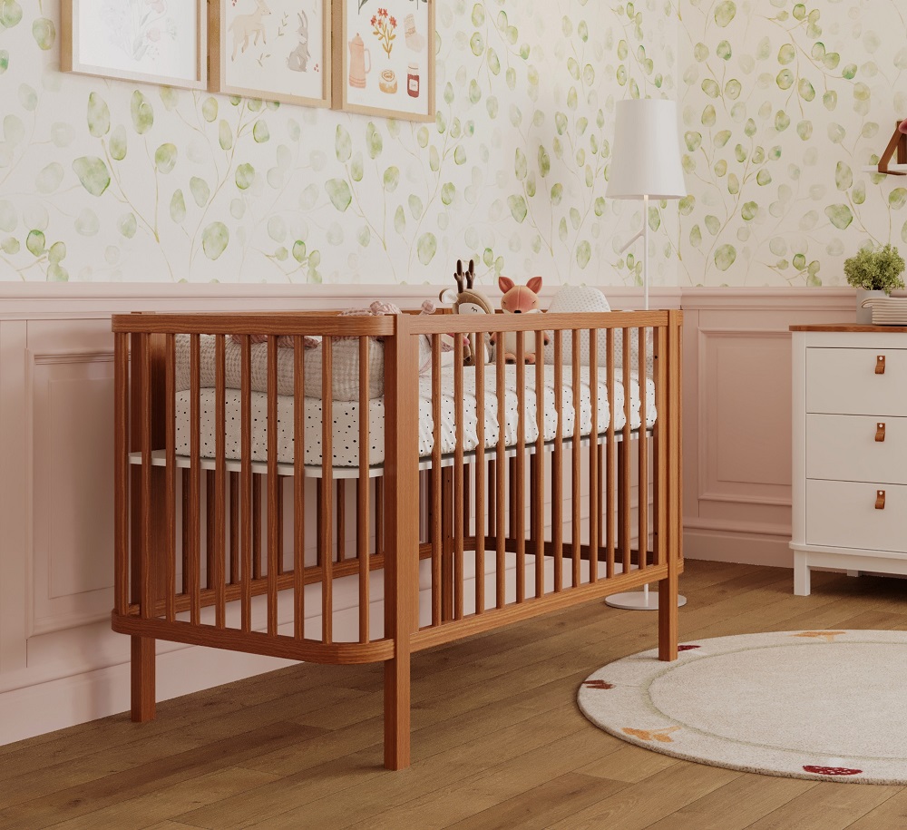 • O Berço é produzido em Madeira Nogueira, resistente e durável.