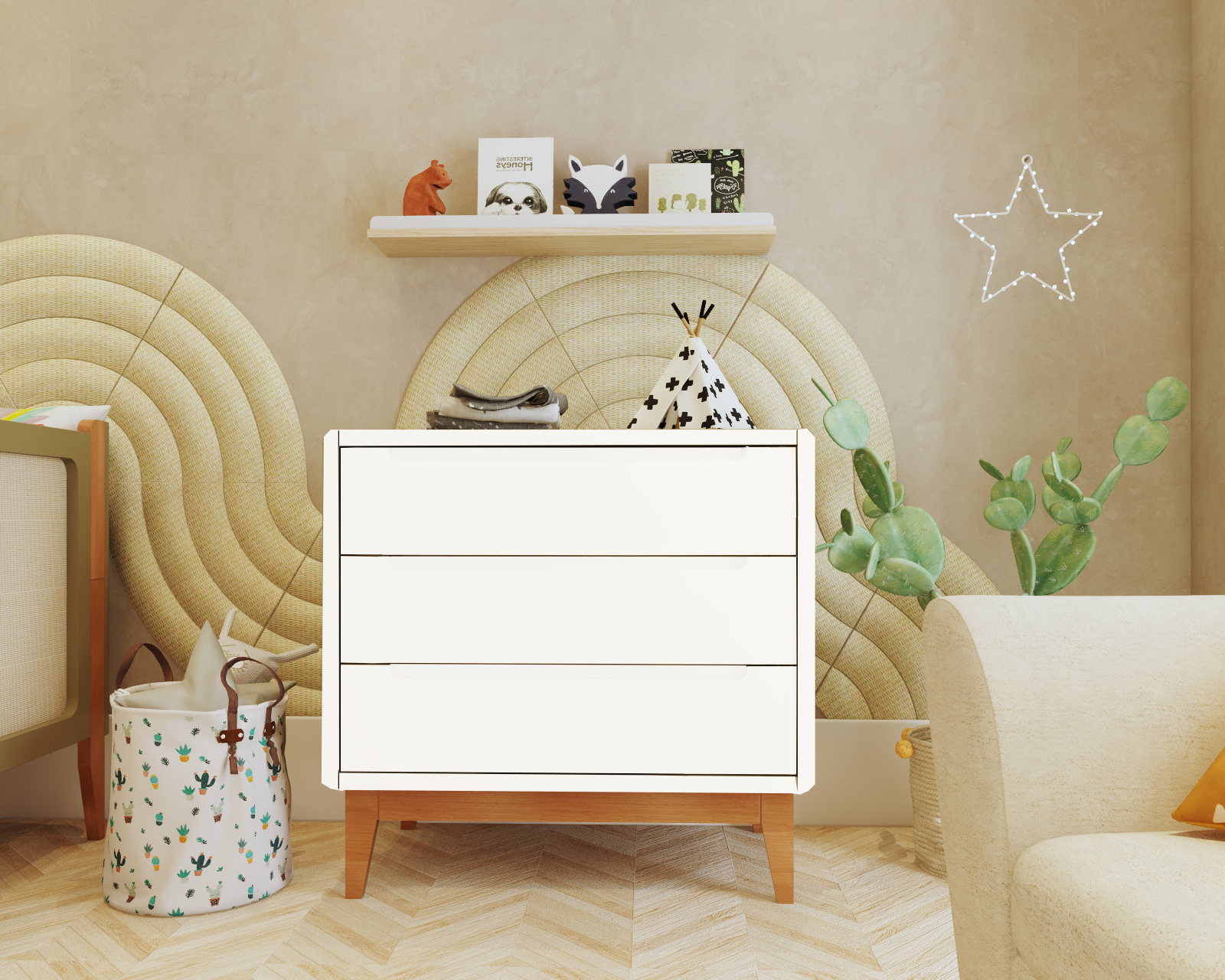 A Cômoda Infantil foi baseada no estilo clean traz consigo conceitos de elegância e charme, suas gavetas com corrediças telescópicas e puxadores redondos exclusivos garantem durabilidade e um toque de sofisticação. A Cômoda de bebe tem um design minimalista e acabamento em madeira clara, ela traz aconchego e leveza para o quarto do seu bebê. Suas três gavetas espaçosas proporcionam amplo espaço para guardar roupas, acessórios ou itens pessoais, mantendo tudo sempre acessível e arrumado. A robustez da estrutura garantem durabilidade. Ideal para quem valoriza praticidade sem abrir mão da estética, a Cômoda infantil transforma seu espaço em um local harmonioso e organizado, elevando o conforto do dia a dia.