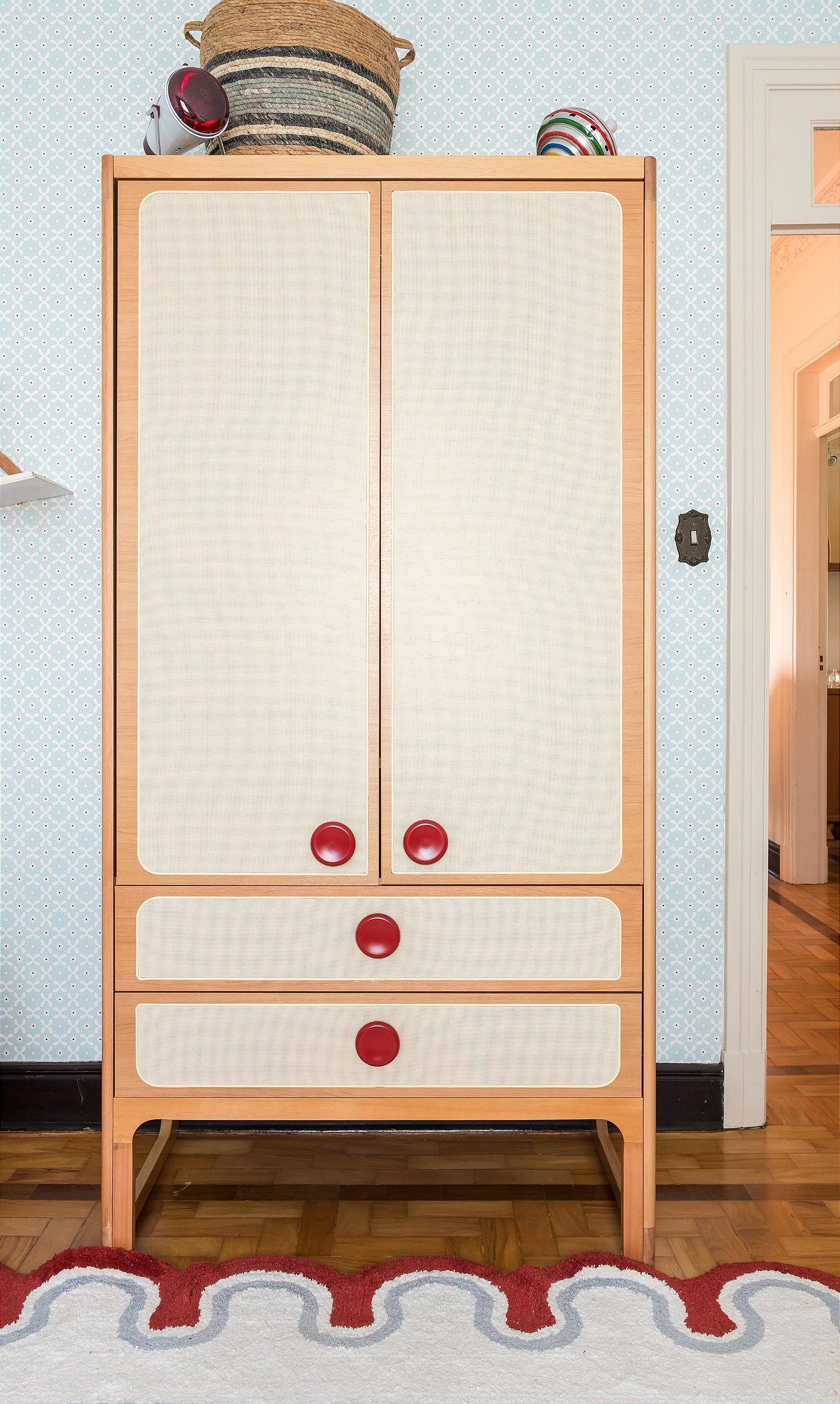 Os puxadores redondos trazem um contraste delicado e divertido, ao mesmo tempo em que remetem a botões de brinquedo ou elementos gráficos infantis. As frentes das gavetas e portas são revestidas com trama texturizada em palha, criando um jogo de luz e sombra que acrescenta profundidade visual ao móvel. As curvas laterais e os recortes nos pés dialogam com o berço e cama, garantindo unidade estética ao ambiente.