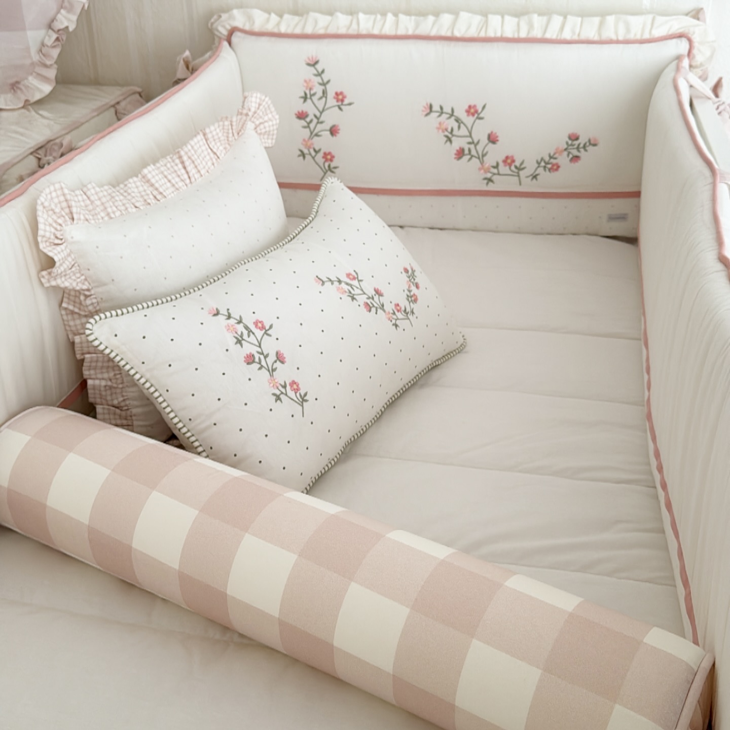O Kit Berço é feito em tricoline e tricô. O Enxoval de berço é composto por 7 peças. A cabeceira, laterais, peseira e almofadas possui zíper e enchimento removível. O Enxoval de berço é super macio e suave, para as mamães que possuem bom gosto e querem um quartinho super moderno, lindo e cheio de charme.