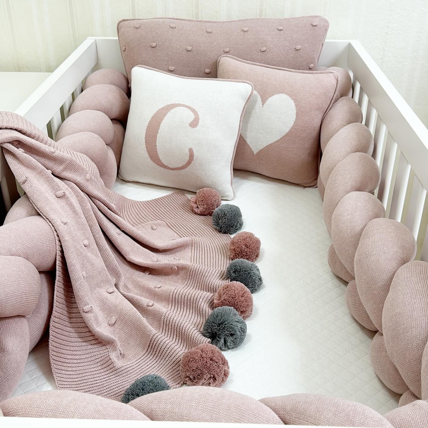 O Kit Berço Menina é feito em Tricô e malha jackard. O Enxoval de berço é composto por 6 peças. A cabeceira, possui zíper e enchimento removível. O Enxoval de berço é super macio e suave, para as mamães que possuem bom gosto e querem um quartinho super moderno, lindo e cheio de charme.